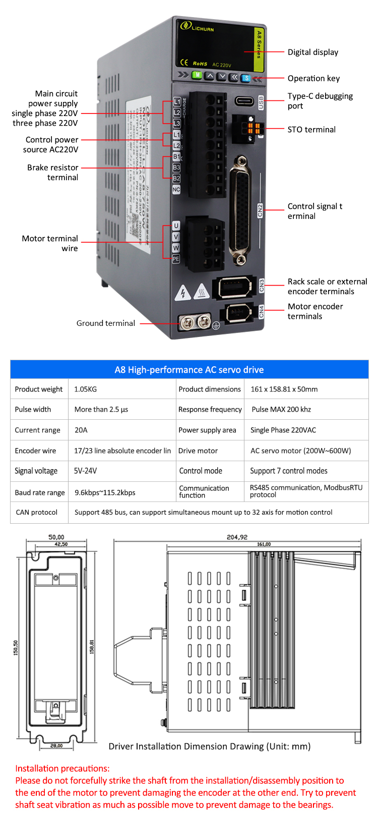 Ang seryeng ito ay isang mataas na pagganap na AC servo drive na may integrated STO (ligtas na metalikang kuwintas) safety torque shutdown function, na sumusunod sa pamantayan sa kaligtasan ng IEC 61800-5-2 at maaaring makamit ang ligtas na pag-shutdown sa kaso ng emerhensiya. Sinusuportahan ng system ang isang buong mode na closed-loop control, at nakamit ang pagpoposisyon ng kawastuhan ng ± isang pulso sa pamamagitan ng feedback na may mataas na resolusyon na encoder, na katugma sa umiikot na mga motor at mga senaryo ng aplikasyon ng motor. Nilagyan ito ng interface ng Type-C debugging, sumusuporta sa pagsasaayos ng parameter ng real-time, at may built-in na RS485 interface ng komunikasyon (ModBus RTU protocol), at ang rate ng baud ay maaaring nababagay mula sa 9.6kbps ~ 115.2kbps. Pinagtibay nito ang algorithm ng Magnetic Field Orientation Control (FOC), na angkop para sa mga okasyong may mataas na dynamic na pagtugon tulad ng katumpakan na CNC at kagamitan sa semiconductor.